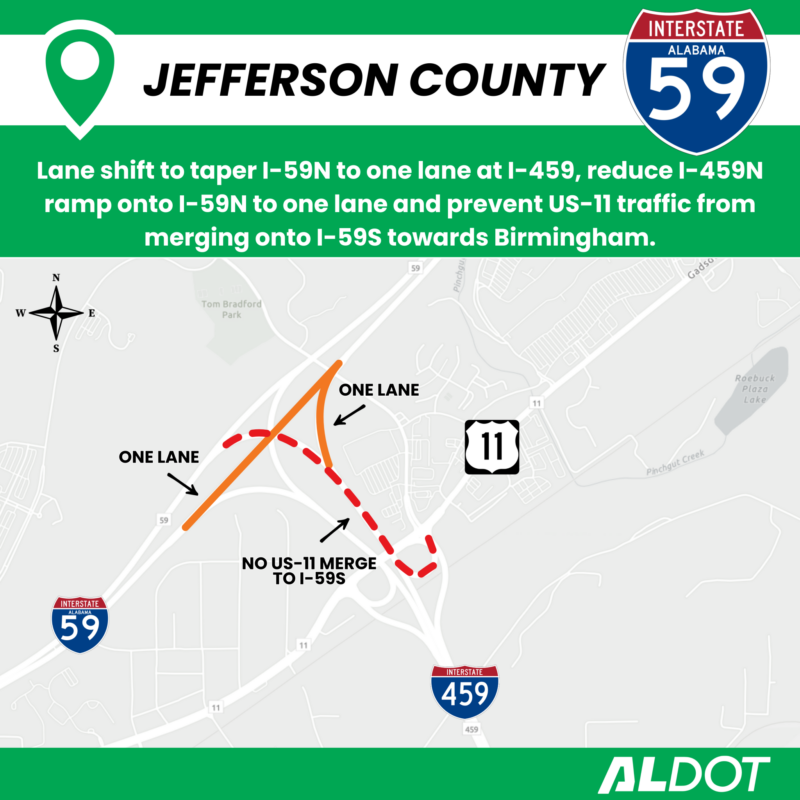 - Second, US-11 traffic traveling onto northbound I-459 will be unable to merge left to take I-59 southbound to Birmingham.
